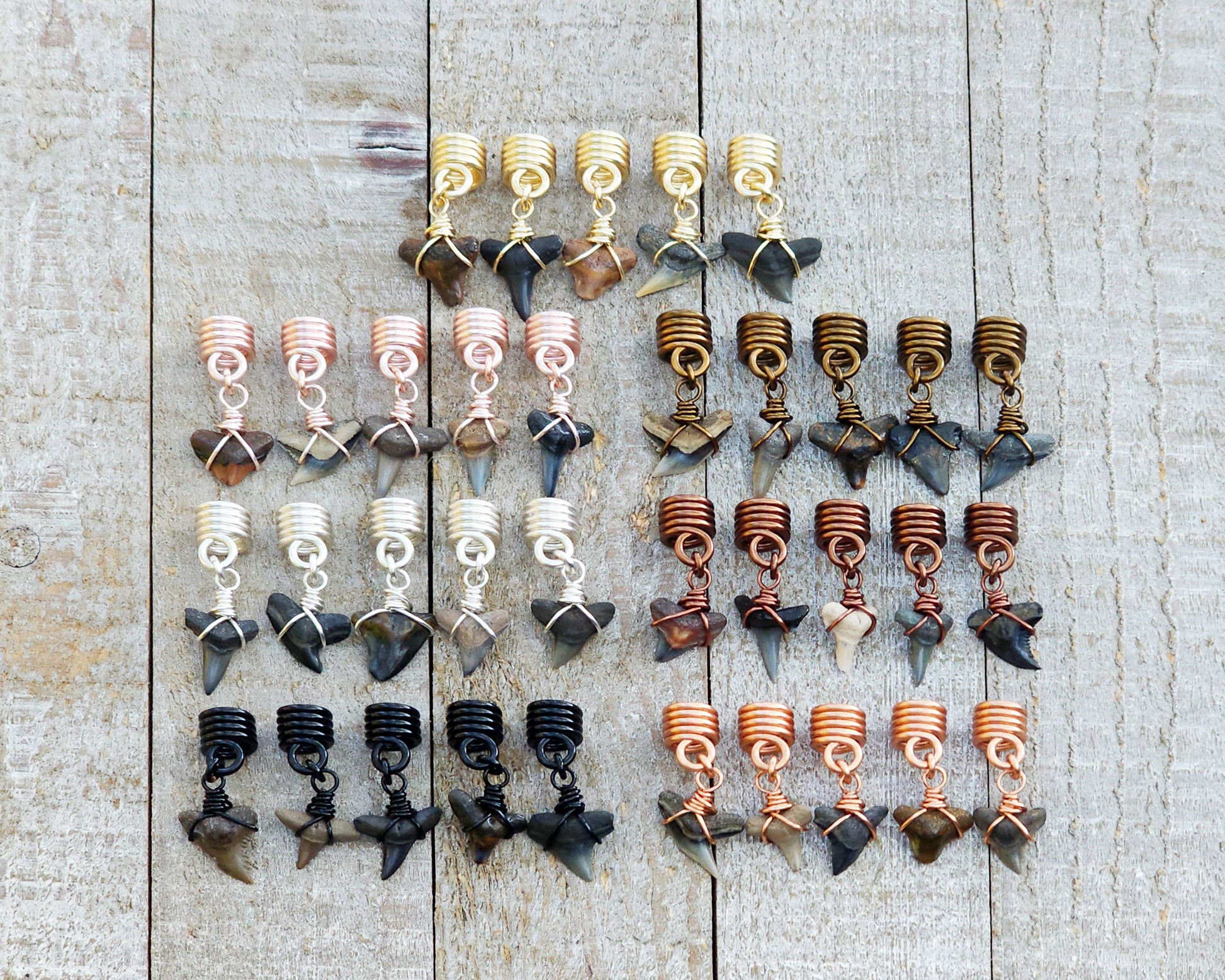 This made to order set of 5 is made in your choice of hole diameter and wire color. The set features 5 randomly chosen fossilized shark teeth collected from Florida's gulf coast. The teeth are estimated to be from the Miocene Epoch which would date the teeth from 5 to 25 million years old.