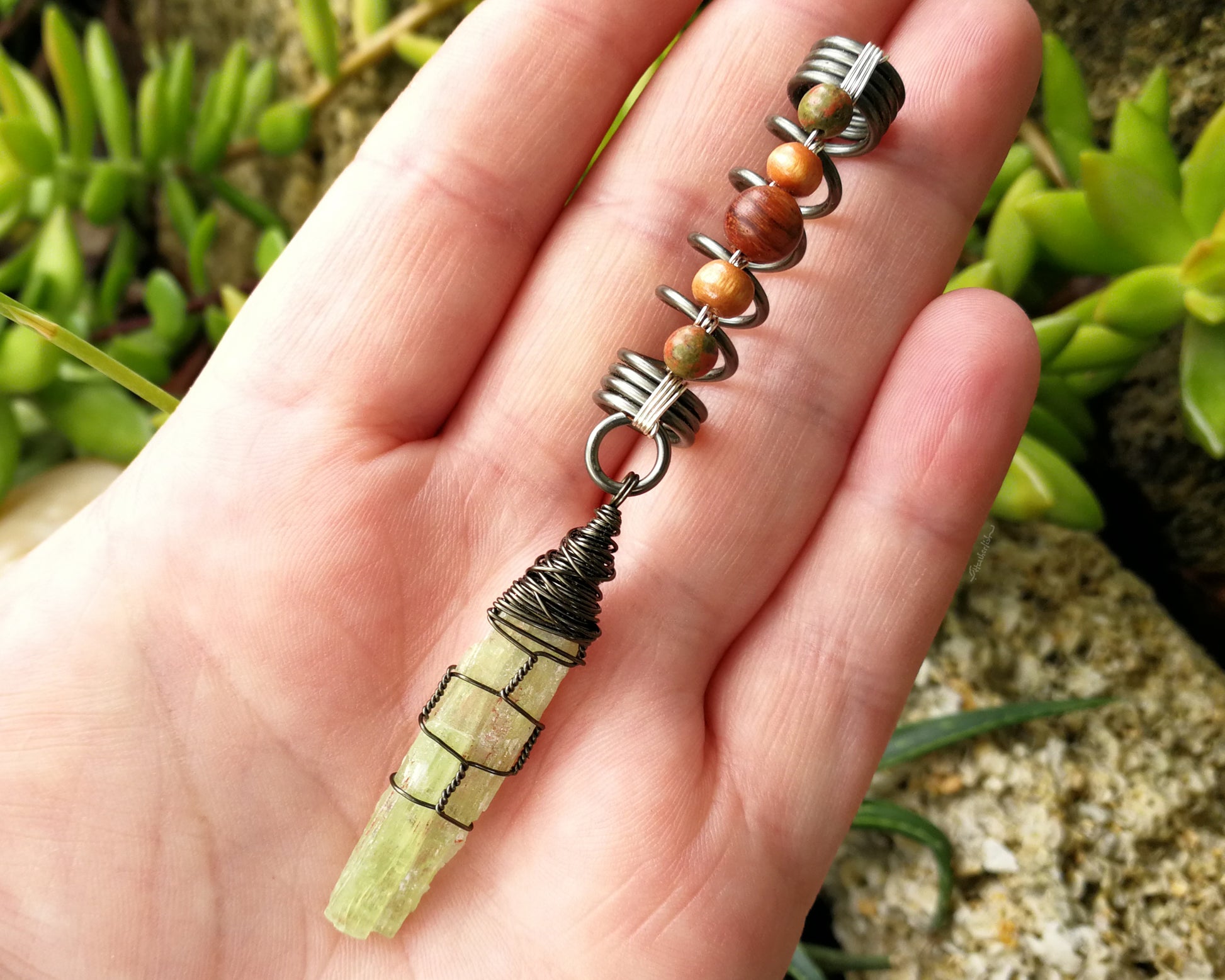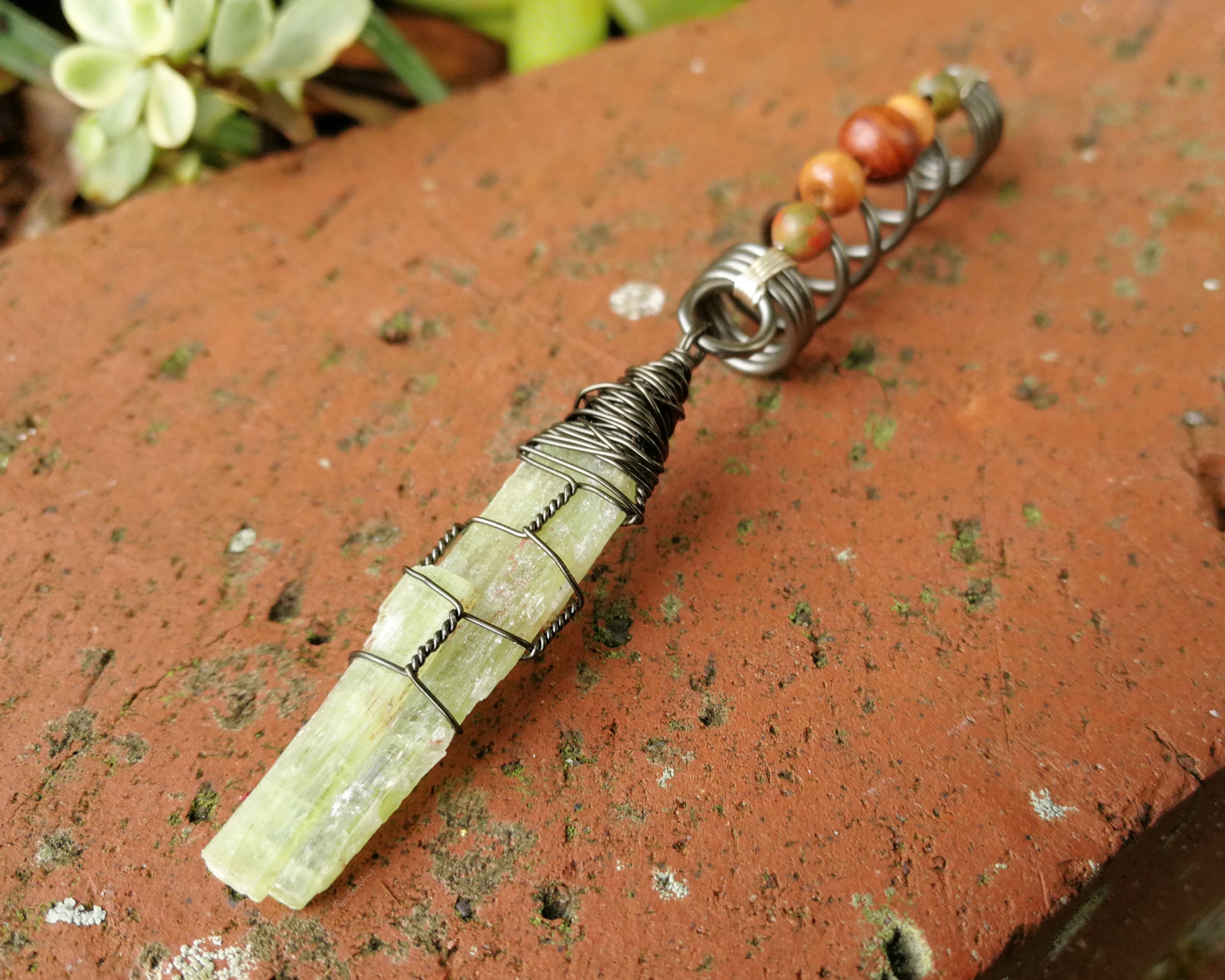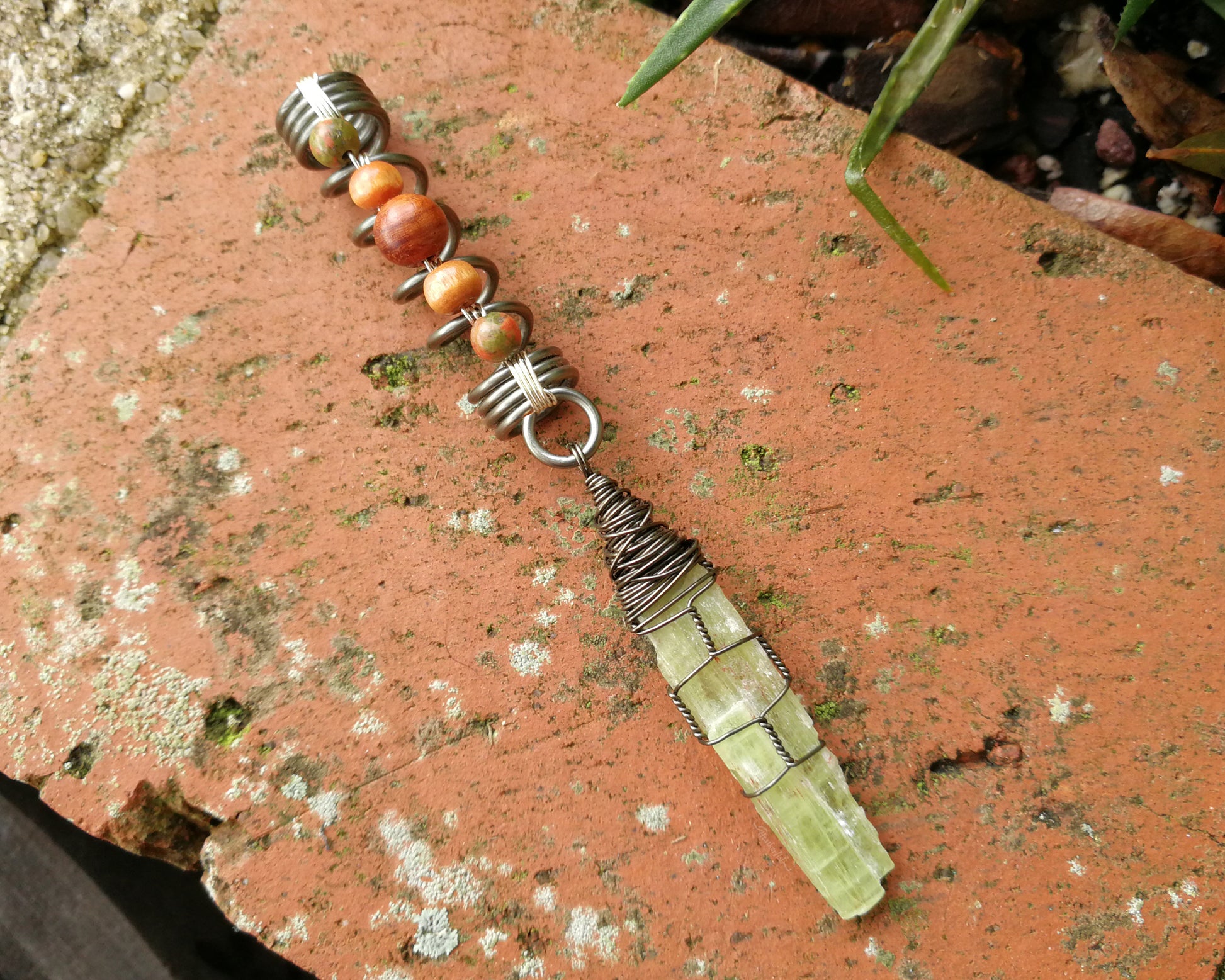 This design is made in the size and wire color of your choosing, and is accented with wood and stone beads, and features a green kyanite crystal.